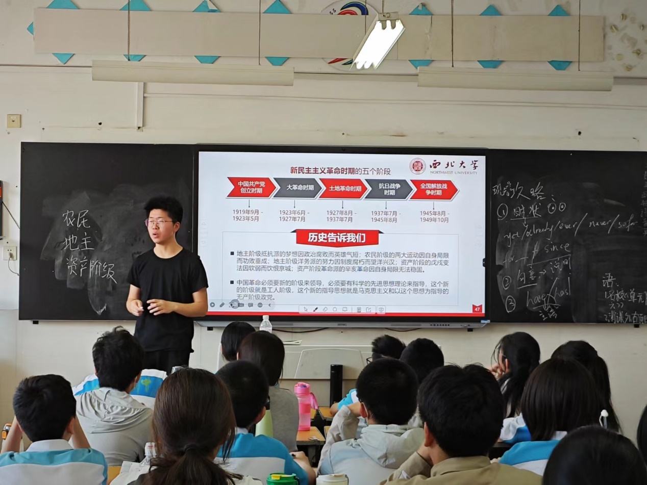 5月22日,我院红桅杆思政理论学习社团在西北大学附属中学,以《习近平新时代中国特色社会主义思想学生读本》(初中)为主要内容,为八年级的学生讲授思政课。主讲人分别是来自2022级和2023级的马克思主义基本原理、马克思主义中国化研究、思想政治教育与中国近现代史基本问题研究专业的9位硕士研究生。